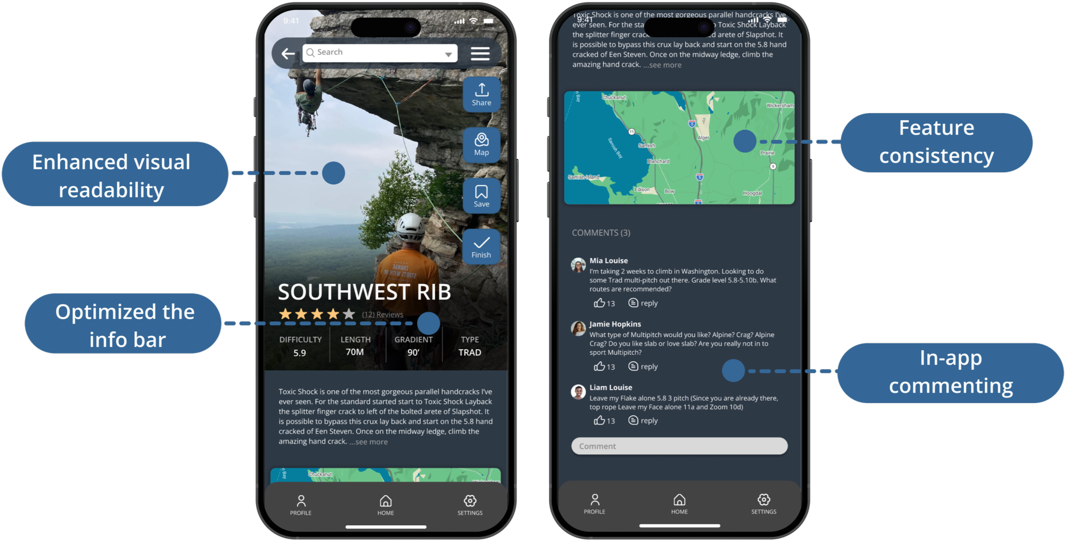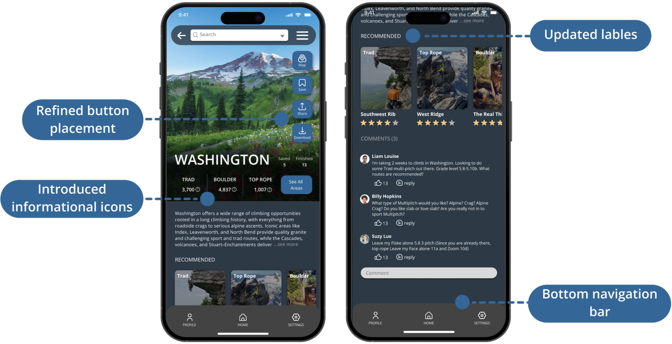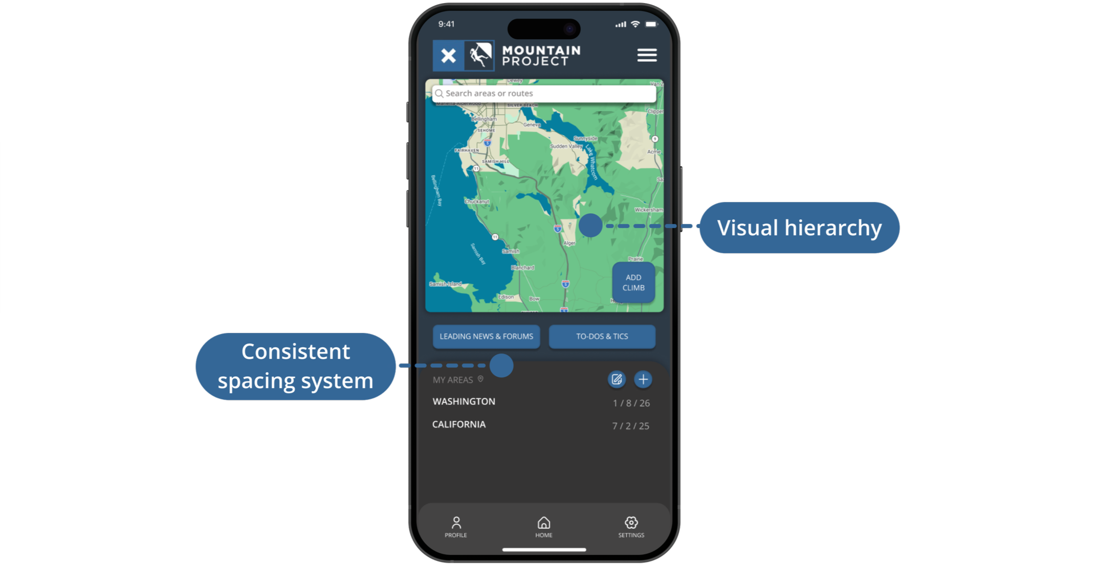 Create a welcoming, easy-to-navigate app tailored to climbers of all experience levels. Improve usability by increasing visual spacing, adding clear written and visual labels, and updating the UI to create a more modern, efficient, and intuitive experience.